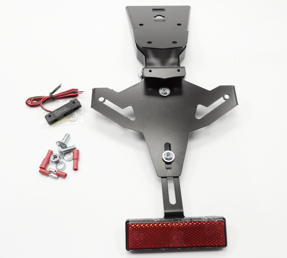 Hochwertiger Kennzeichenträger für ihre Kawasaki ZX10R im Set mit LED Kennzeichenbeleuchtung und abnehmbarer Rückstrahler im sehr sportlichen Design.