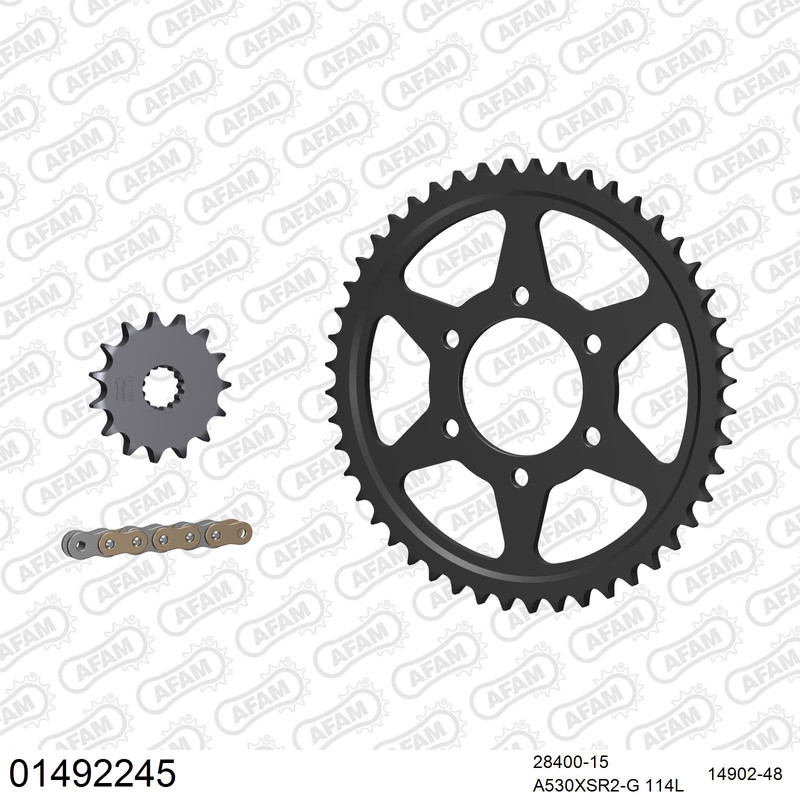 AFAM Kettenkit für Motorräder mit hochwertiger AFAM 530 Antriebskette vom Typ XSR2-G inklusive passendem Nietschloss (Hohlbolzen).