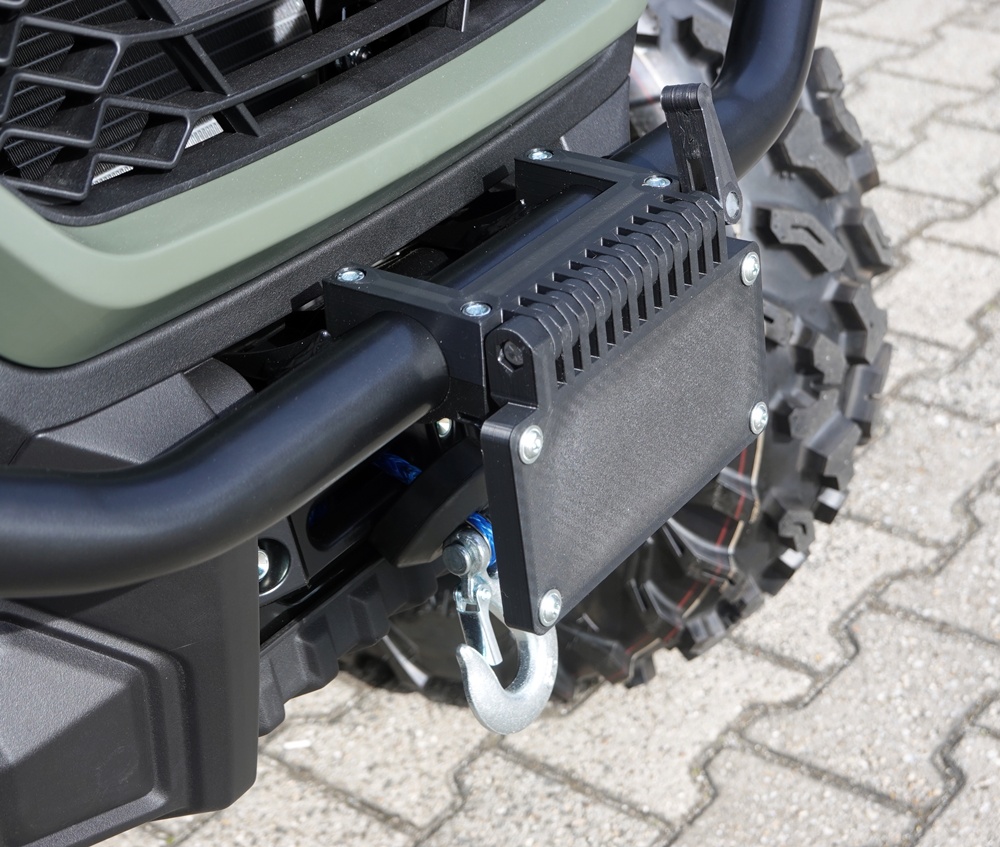 Mit dieser klappbaren Nummernschildhalterung passend für QJ Motor SFA 600 und SFA 1000 DLX Modelle mit der Originalen vorderen Stoßstange ist es möglich bei einer Benutzung der Seilwinde das Kennzeichen schnell und einfach hochzuklappen und in einer beliebigen Position zu positionieren.