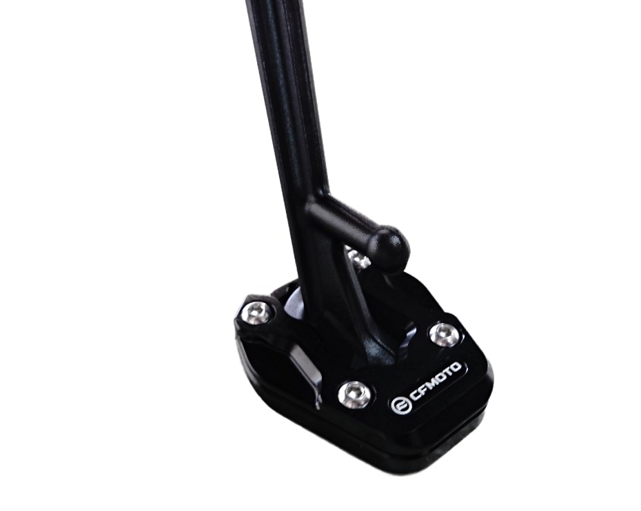 Hochwertige Seitenständer Auflagenvergrößerung von CFMoto, 2 Teilig aus Aluminium CNC gefräst. Die Auflagefläche des Seitenständers wird erheblich vergrößert und garantiert einen festeren Stand des Motorrades auch bei weichem Untergrund.