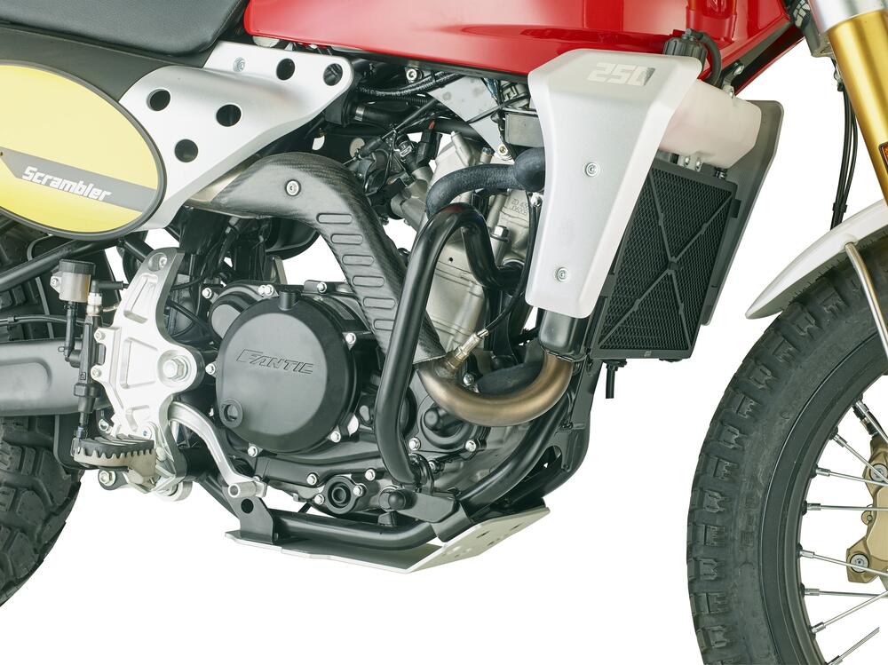 Motorrad spezifischer Sturzbügel von Fantic, verringert oder verhindern bei einem Sturz oder bei einem Umfallen des Motorrads Schäden am Fahrgestell, Motor und Verkleidung.