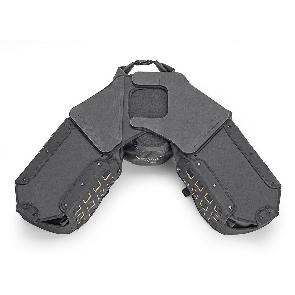 Diese praktische Lösung garantiert maximale Anpassungsfähigkeit und kann auf allen Enduro- und Maxienduro-Motorrädern verwendet werden, wodurch das Gewicht von zusätzlichen Tragrahmen entfällt. Der Hauptkörper der Basis dieses innovativen Dreigespanns besteht aus extrem stoß- und abriebfesten Materialien wie Cordura und Hypalon.