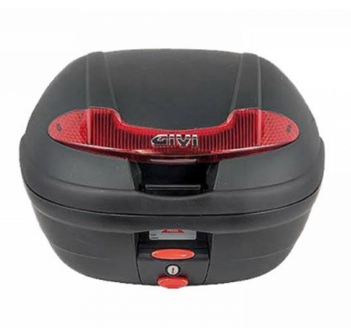 Der Givi Monolock Koffer vom Typ E340 Vision ist ausgestattet mit roten Reflektoren.