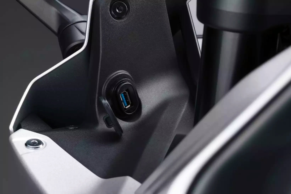 Original Suzuki USB Steckdose mit Abdeckkappe aus Gummi und 5 Volt Ausgangsleistung mit 2 Amper für den Einbau an der linken Seite des Cockpits.