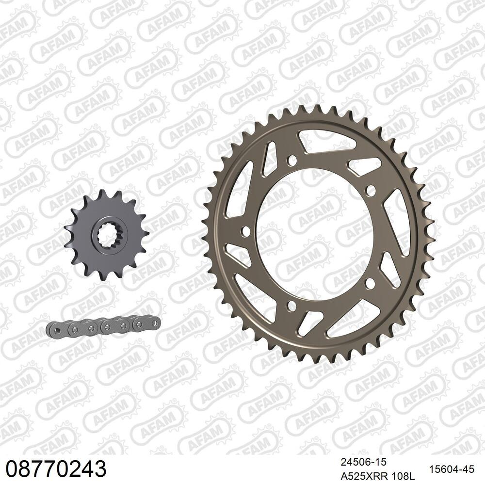 AFAM Kettenkit für Motorräder mit hochwertiger AFAM 525 Antriebskette vom Typ XMR3 inklusive passendem Nietschloss (Hohlbolzen).