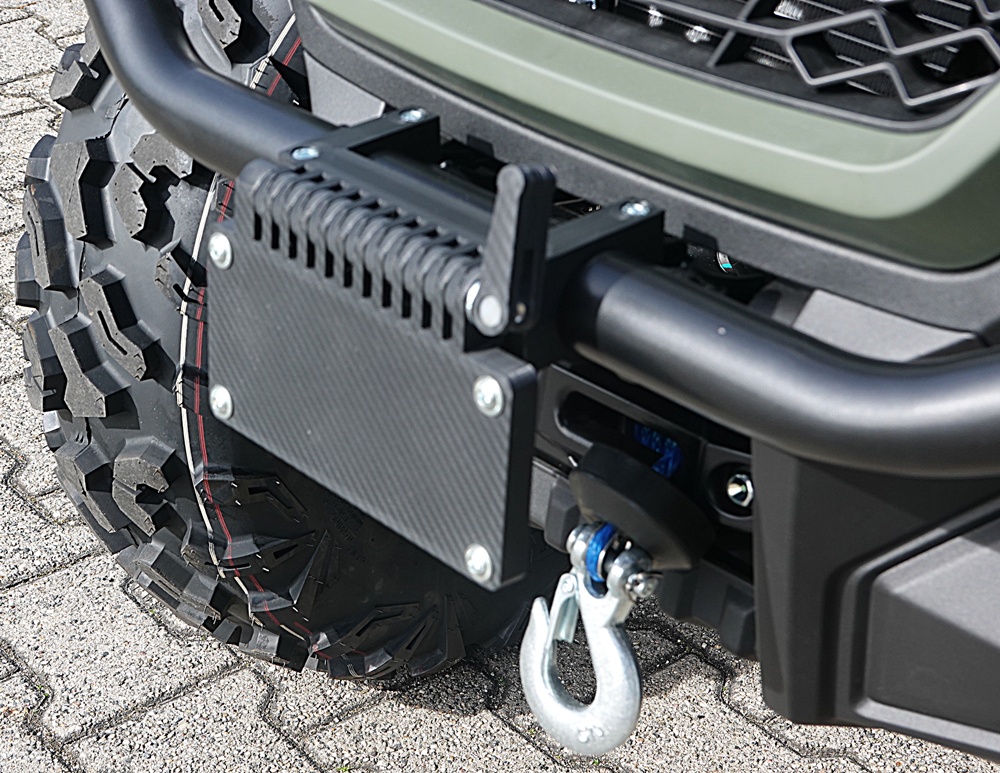 Mit dieser klappbaren Nummernschildhalterung passend für QJ Motor SFA 600 und SFA 1000 DLX Modelle mit der Originalen vorderen Stoßstange ist es möglich bei einer Benutzung der Seilwinde das Kennzeichen schnell und einfach hochzuklappen und in einer beliebigen Position zu positionieren.