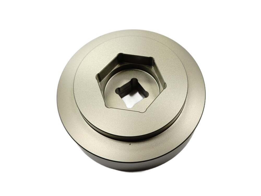 Aus Aluminium CNC gefräst und hart eloxiert besitzt die Nuss eine 30 mm - 6 Kant Aufnahme und eine 55 mm - 12 Kant Aufnahme.